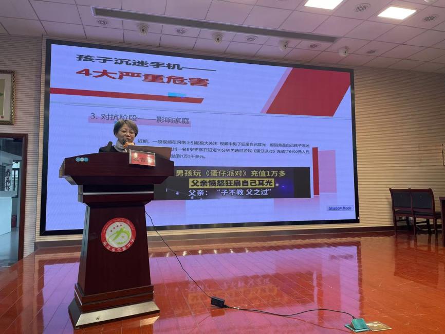 会议开始,风行栖霞讲师团、栖霞中学校家社协同育人促进中心负责人栖霞中学“萍聚话家道”工作坊负责人王苏萍带来主题讲座——《读懂孩子手机成瘾背后的成长密码》。王老师从沉迷手机的四大危害、沉迷手机的原因、案例分享与总结、家长的错误做法、7脉密码降低对手机的依赖几大角度出发,和家长讨论如何应对孩子沉迷手机这一问题。王老师建议各位家长,多给孩子表扬和鼓励,要发现孩子身上的的闪光点,用不断的鼓励,让孩子在学习和现实世界中收获快乐,摆脱虚拟世界的过度依赖。